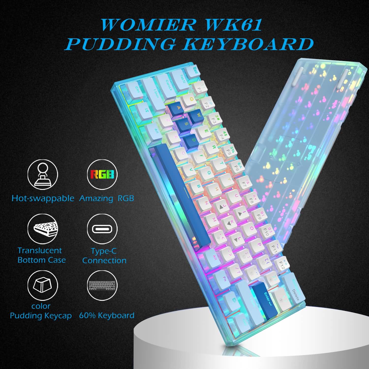 Womier WK61 Mechanical keyboard come with 24pcs Colored pudding keycap that can be replaceable, You can freely match the colors you like. So that you can DIY and do whatever you want.